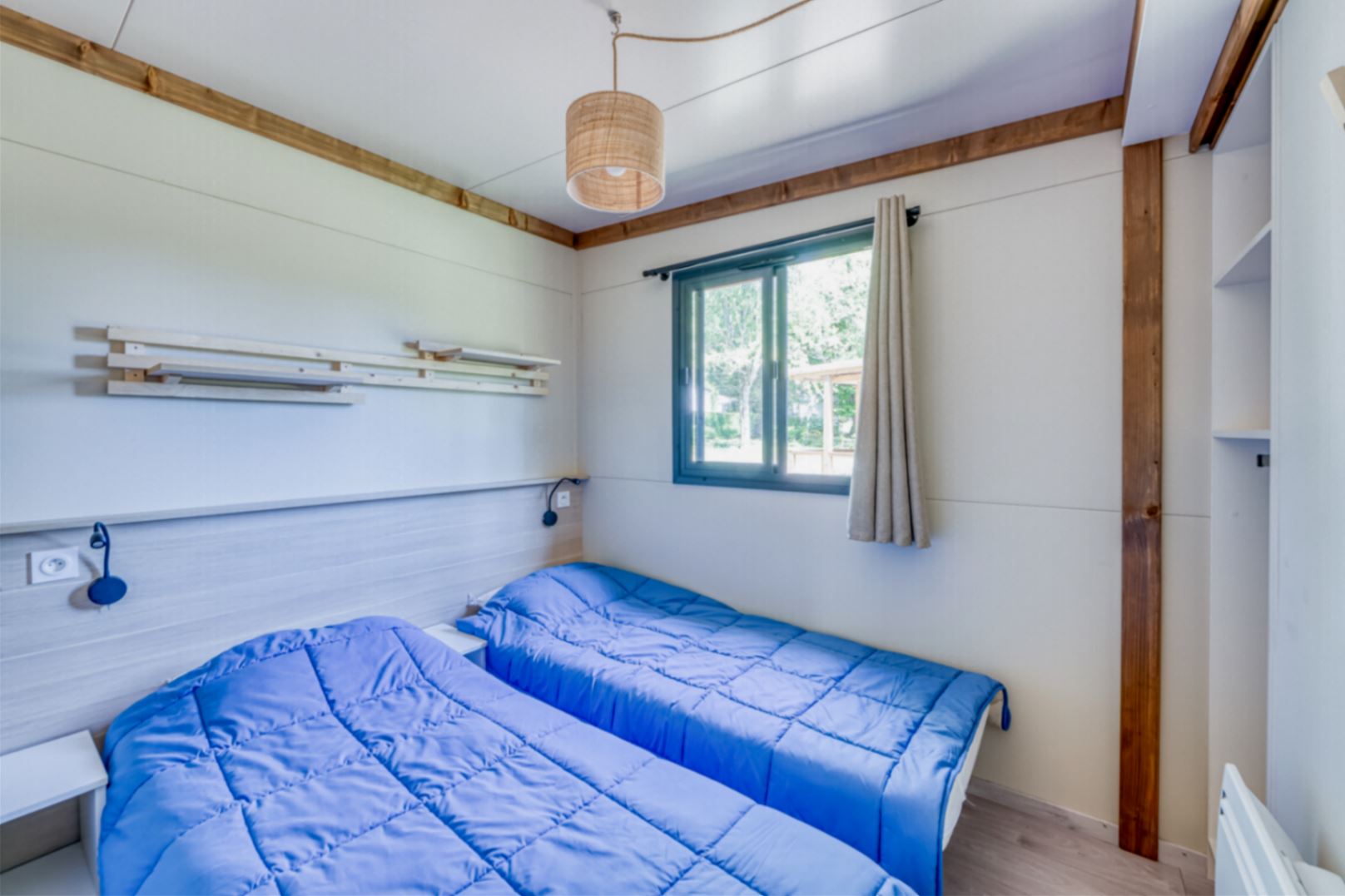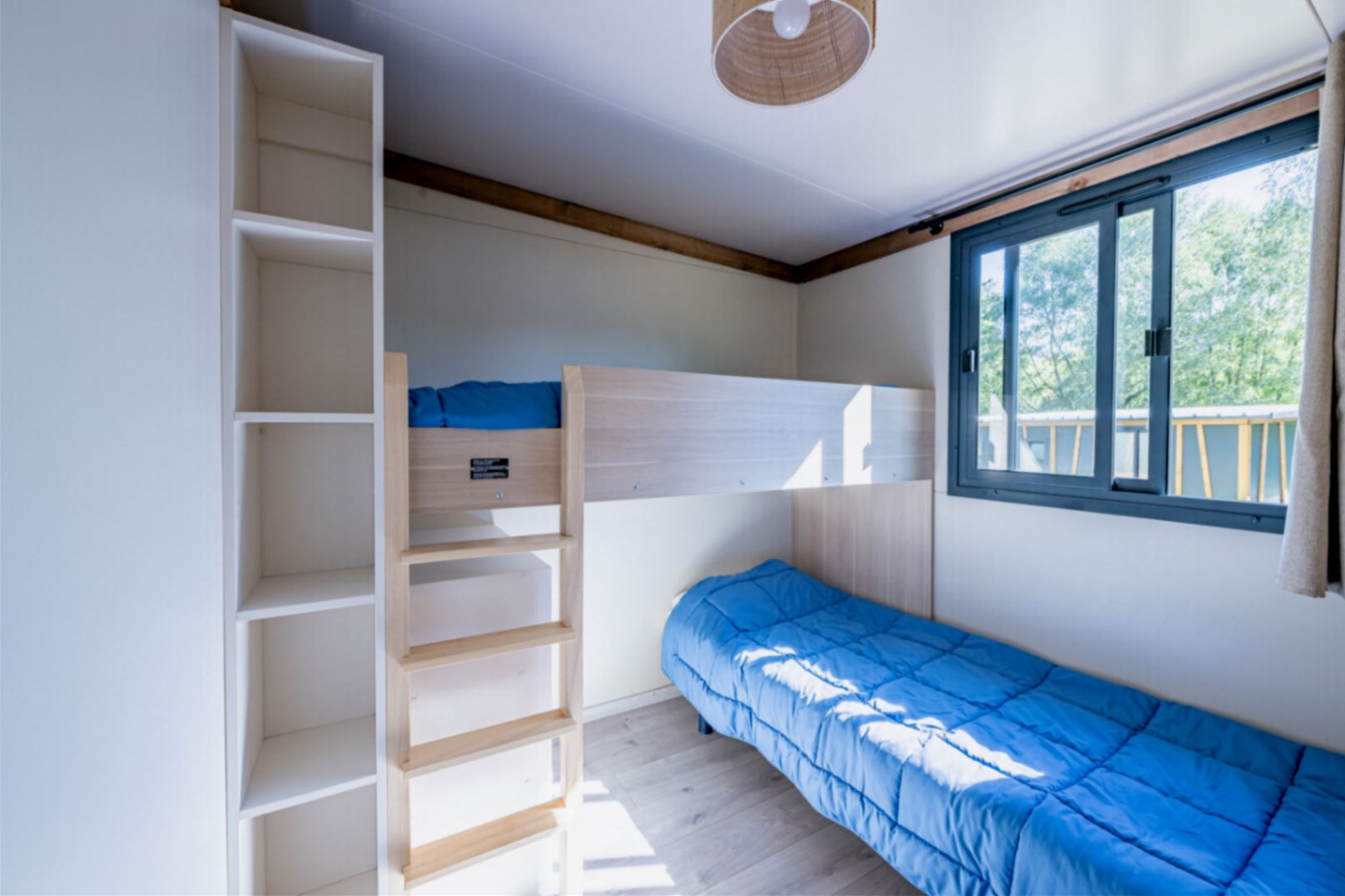 Sleeping area: one bedroom with 1 double bed, two bedrooms with 2 single beds side by side and bunk in corner, pillows and blankets provided