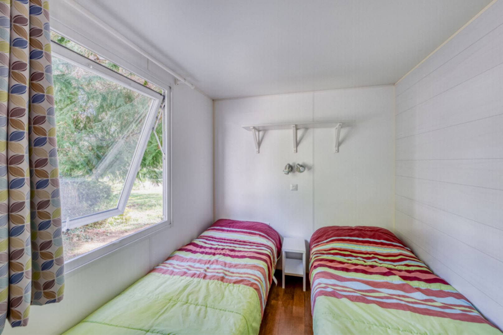 Sleeping area: one bedroom with 1 double bed (140×190), one bedroom with 2 single beds side by side (80×190), pillows and blankets provided