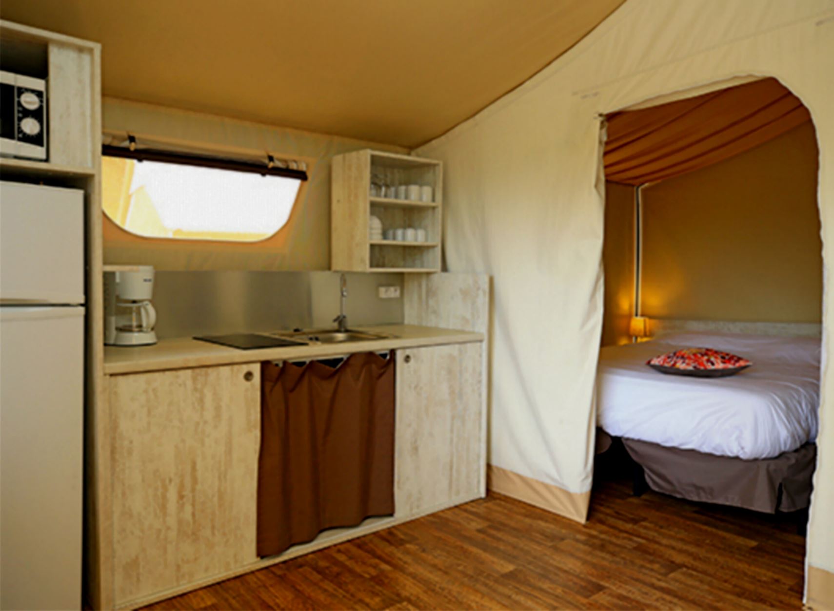 Coin cusine/séjour : cuisine équipée : évier, plaques élecritique (vitrocéramiques), réfrigérateur/congélateur, cafetière à filtre, micro-onde, vaisselle.
